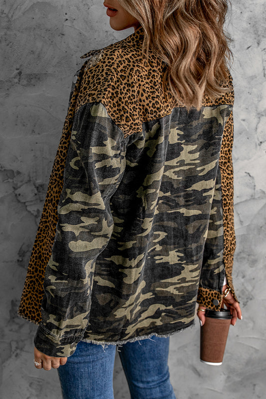 Animal Print Camouflage Raw Hem Denim Jacket
