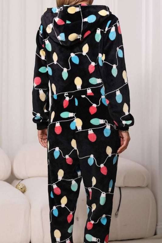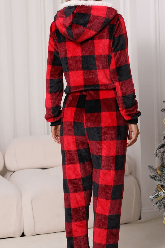 Christmas Zip Up Flannel Hooded Jumpsuit