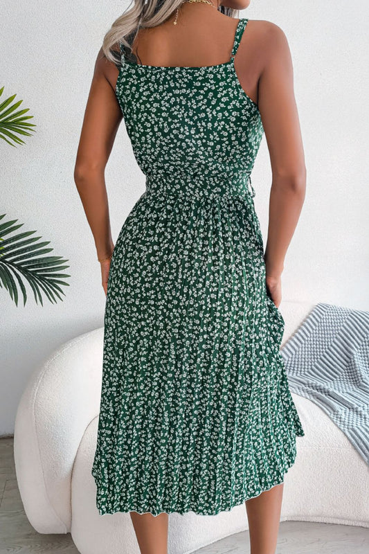Ditsy Floral Belted Spaghetti Strap Pleated Dress