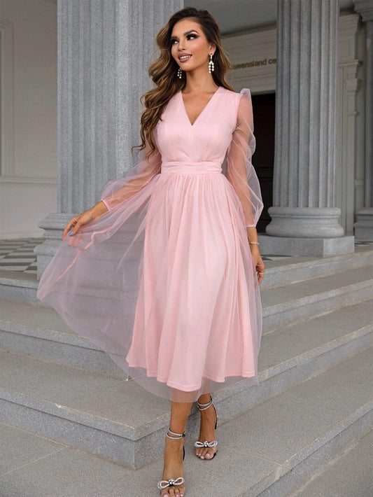 Mesh Puff Sleeve V-Neck A-Line Dress