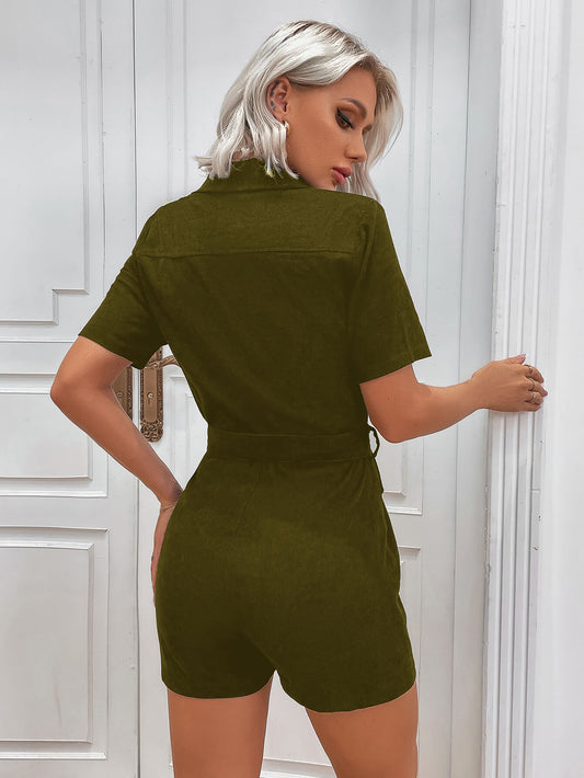 Zip Up Belted Short Sleeve Collared Romper