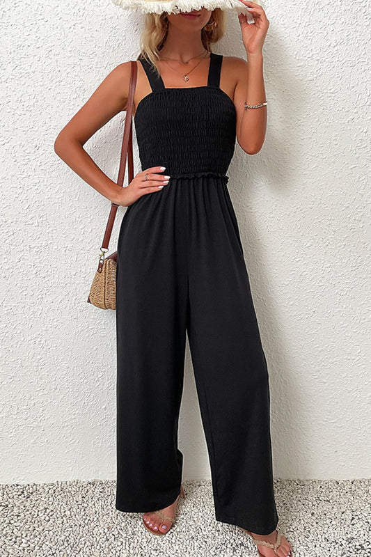 Smocked Sleeveless Wide Leg Jumpsuit with Pockets