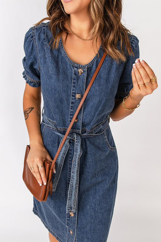 Button Front Tie-Waist Puff Sleeve Denim Dress