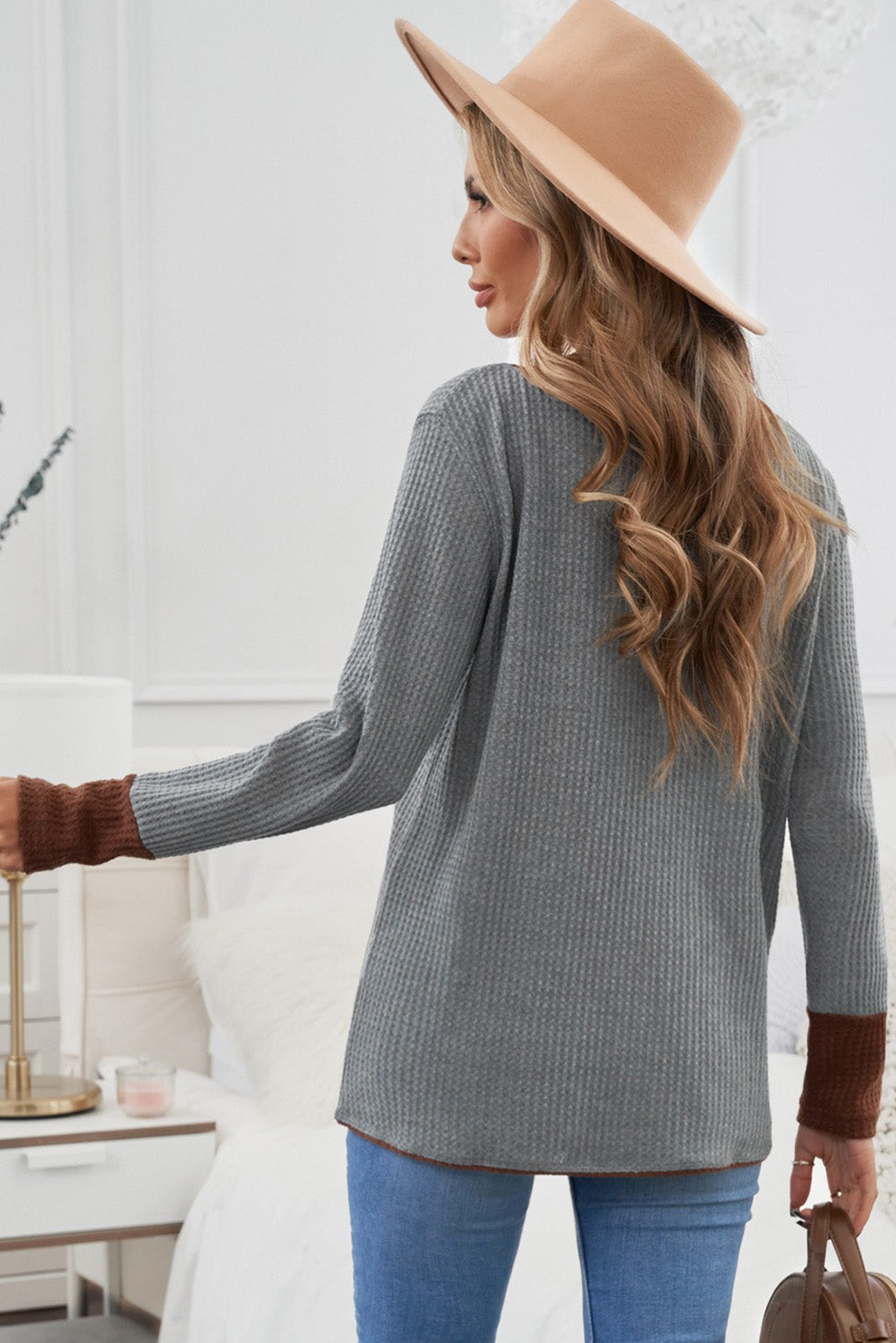 Contrast Trim V-Neck Waffle Knit Top