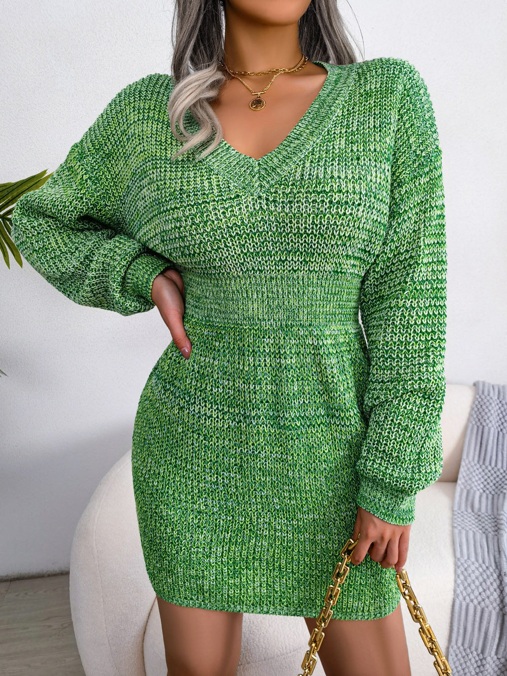 Heathered V-Neck Dropped Shoulder Sweater Dress