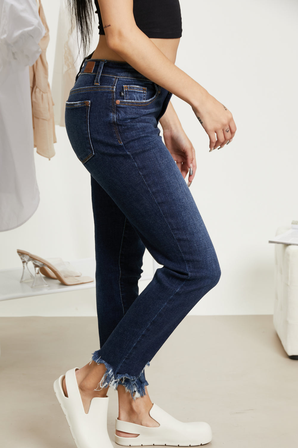 Slim fit, mid-rise, with a destroyed hem, these Judy Blues are a winner in our book! The dark wash is classy and timeless, while the destroyed hem adds a modern touch.
