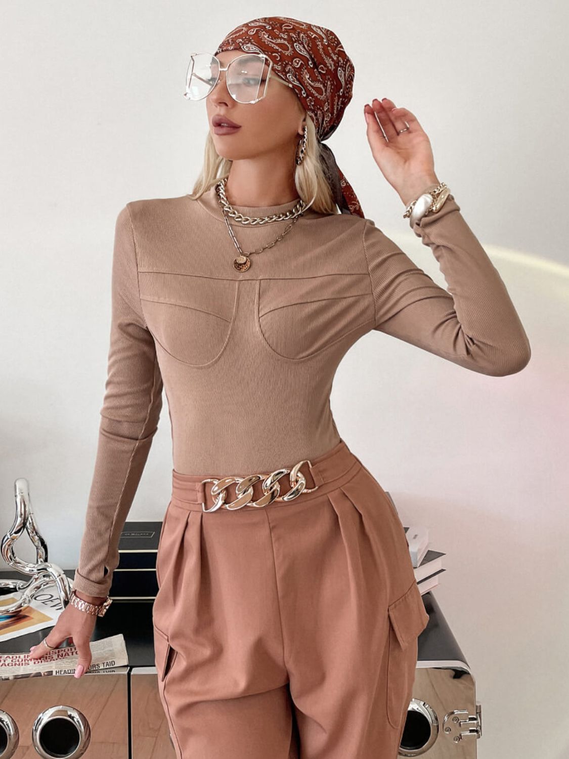 Ribbed Mock Neck Thumbhole Bodysuit
