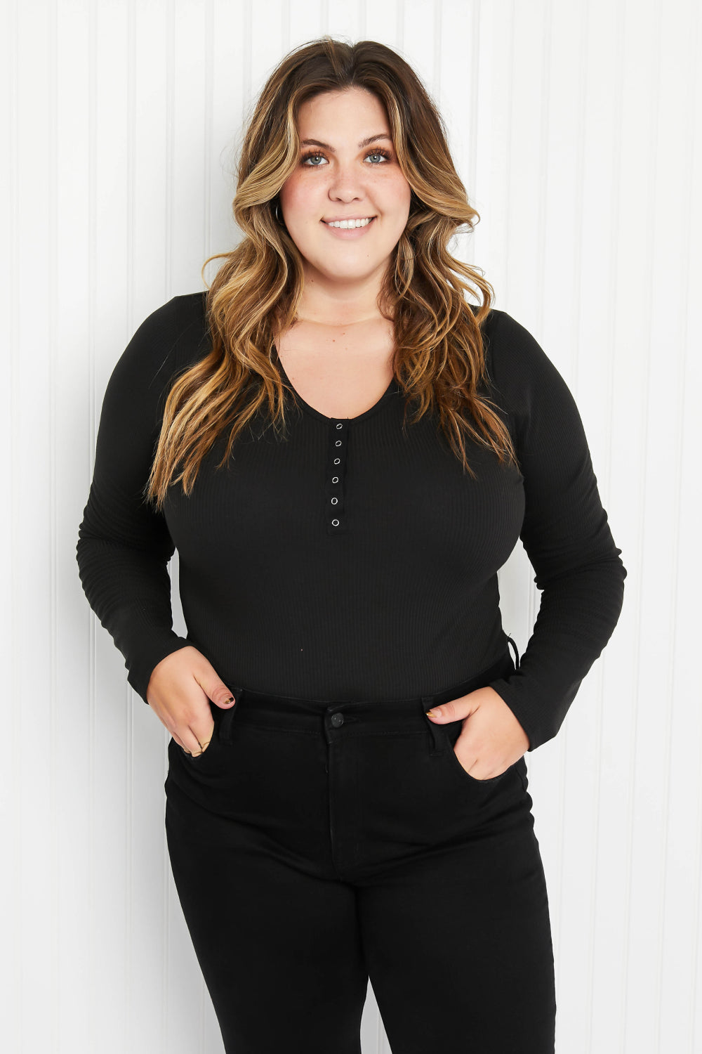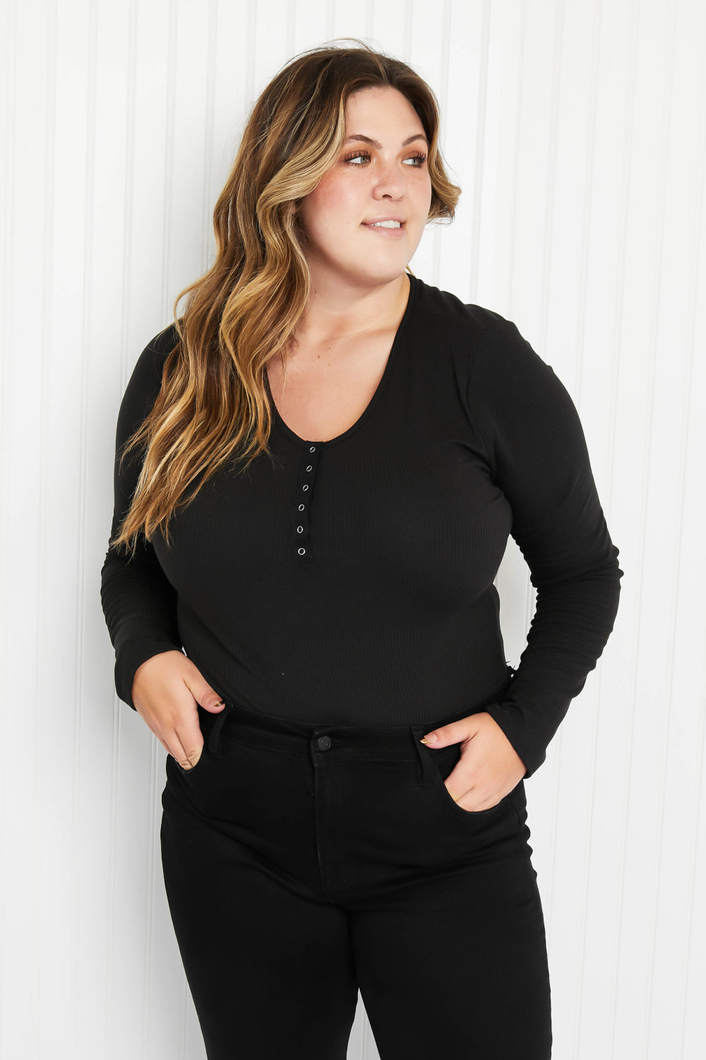 Up your layering game with this ribbed bodysuit in a henley design. Featuring long sleeves and functional snaps, you can customize this piece to fit your preferences -- keep all the snaps closed or roll up the sleeves to change up the look.