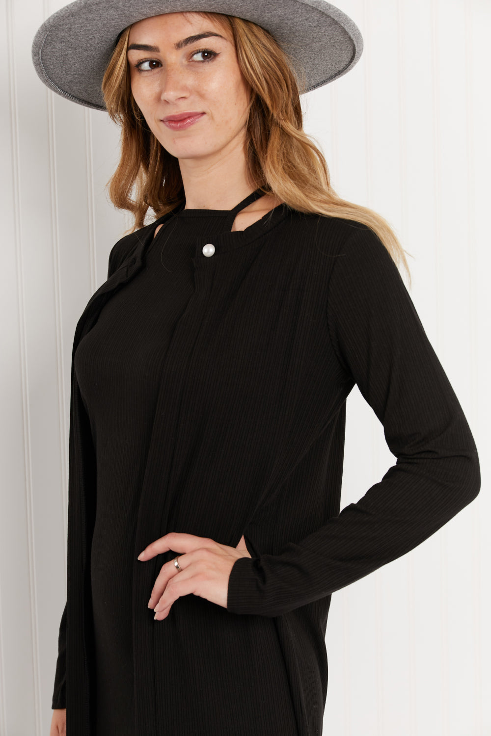 The sleek design of this midi dress is enhanced by an appealing halter neckline and slit. Add the longline cardigan over the top to complete the look!